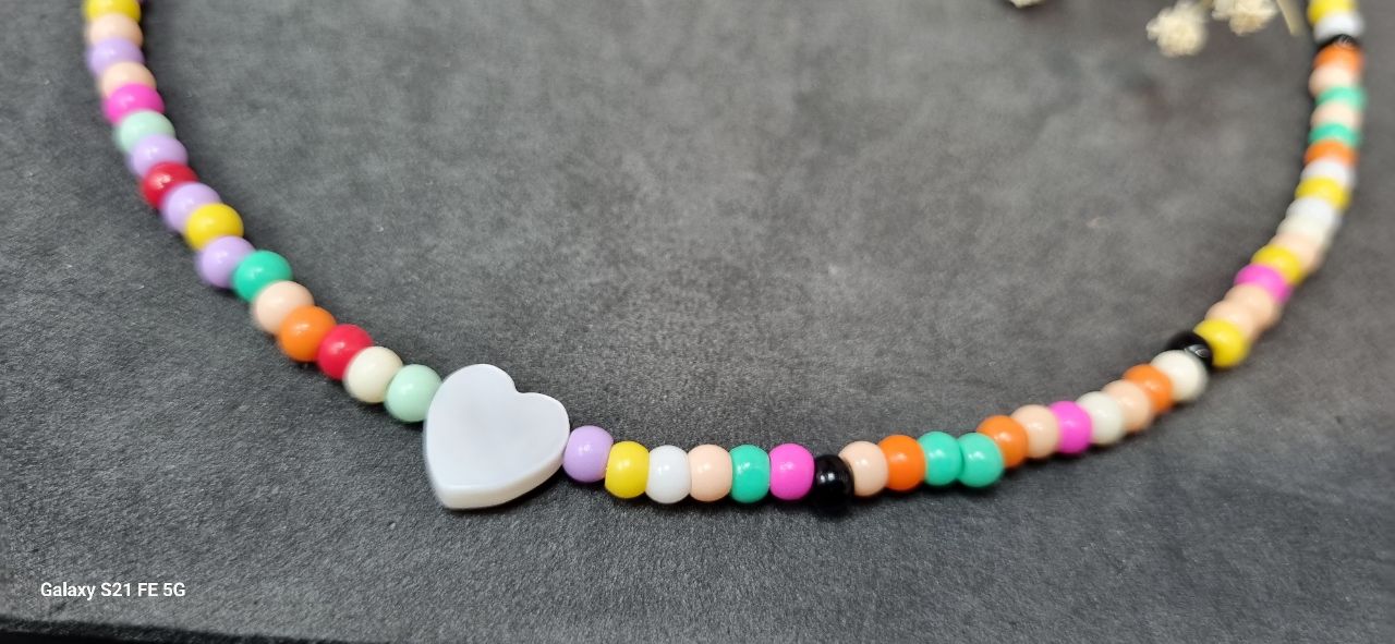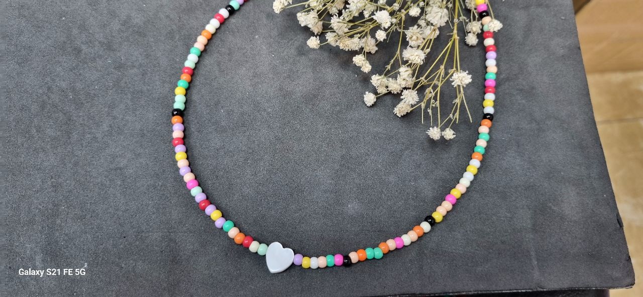 گردنبند منجوق پفکی رنگی و قلب صدف طبیعی