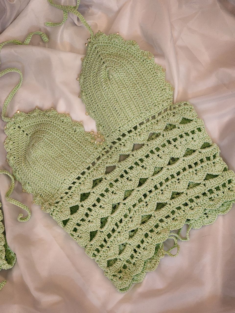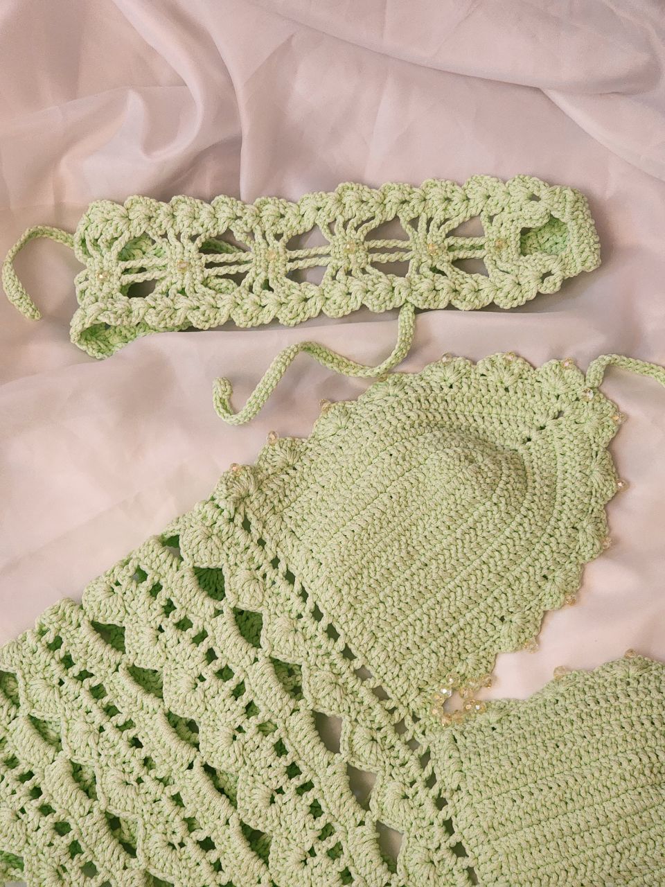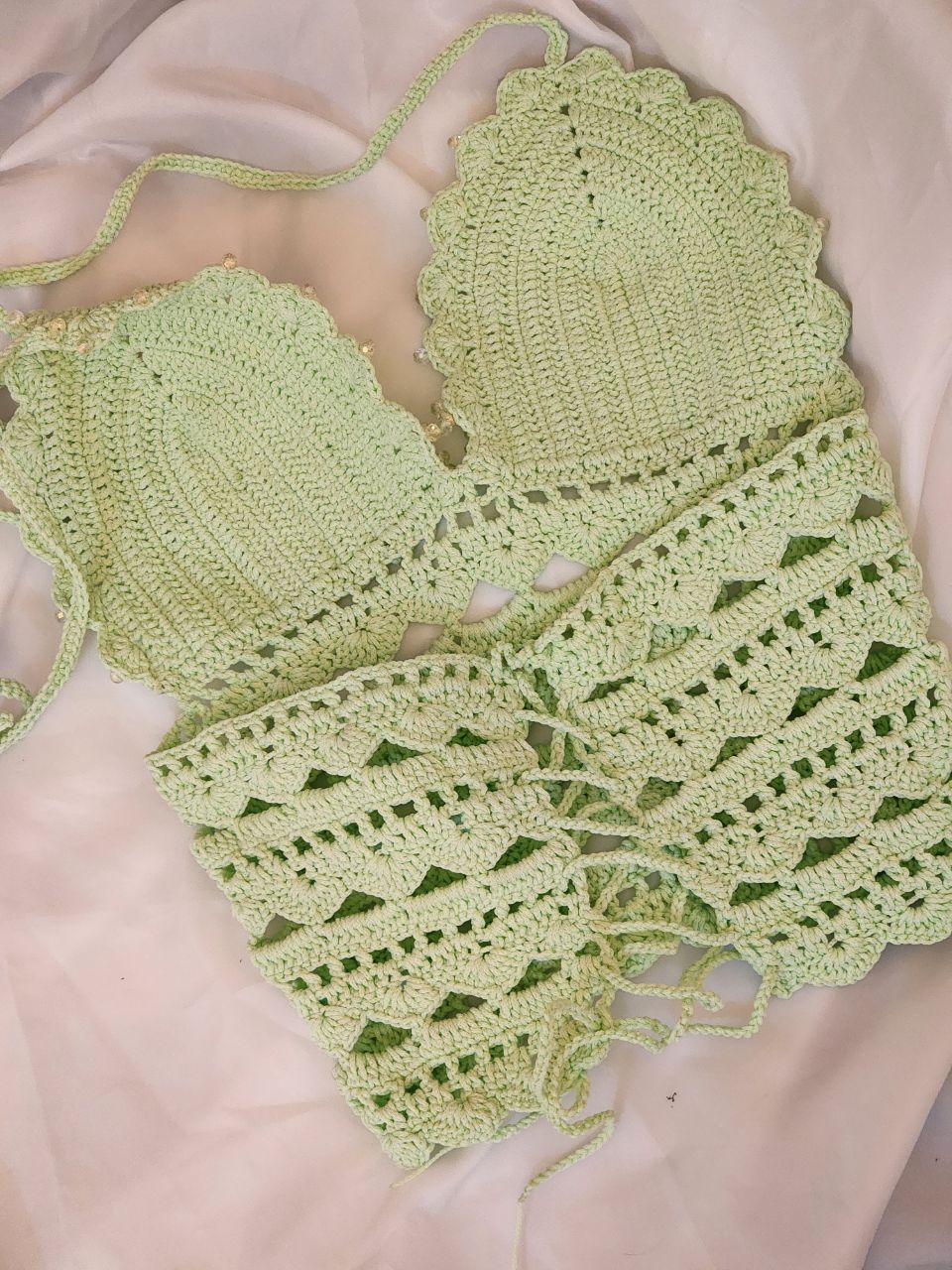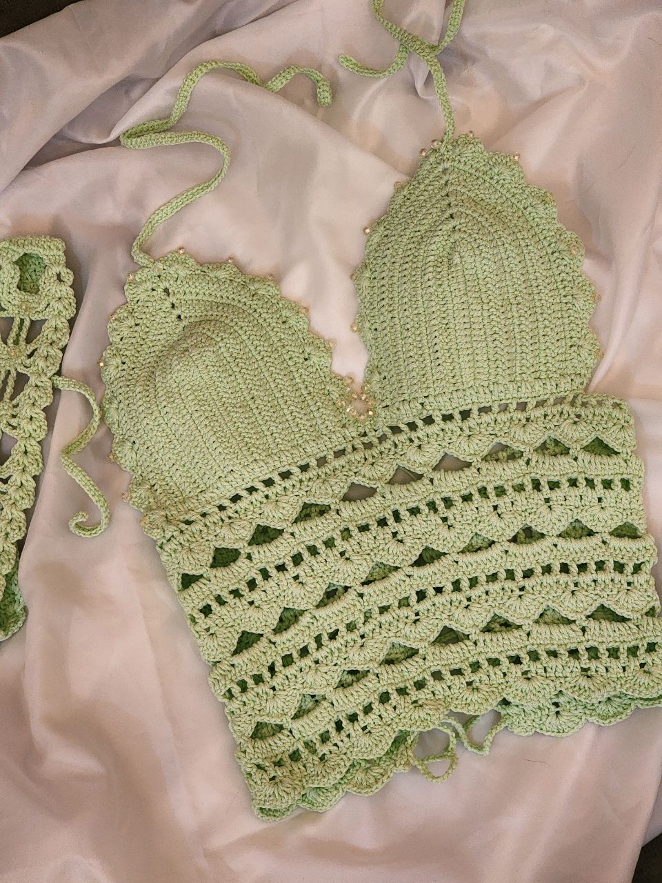 ست نیم تنه کراپ و هد سربند مکرومه سبز پاستیلی