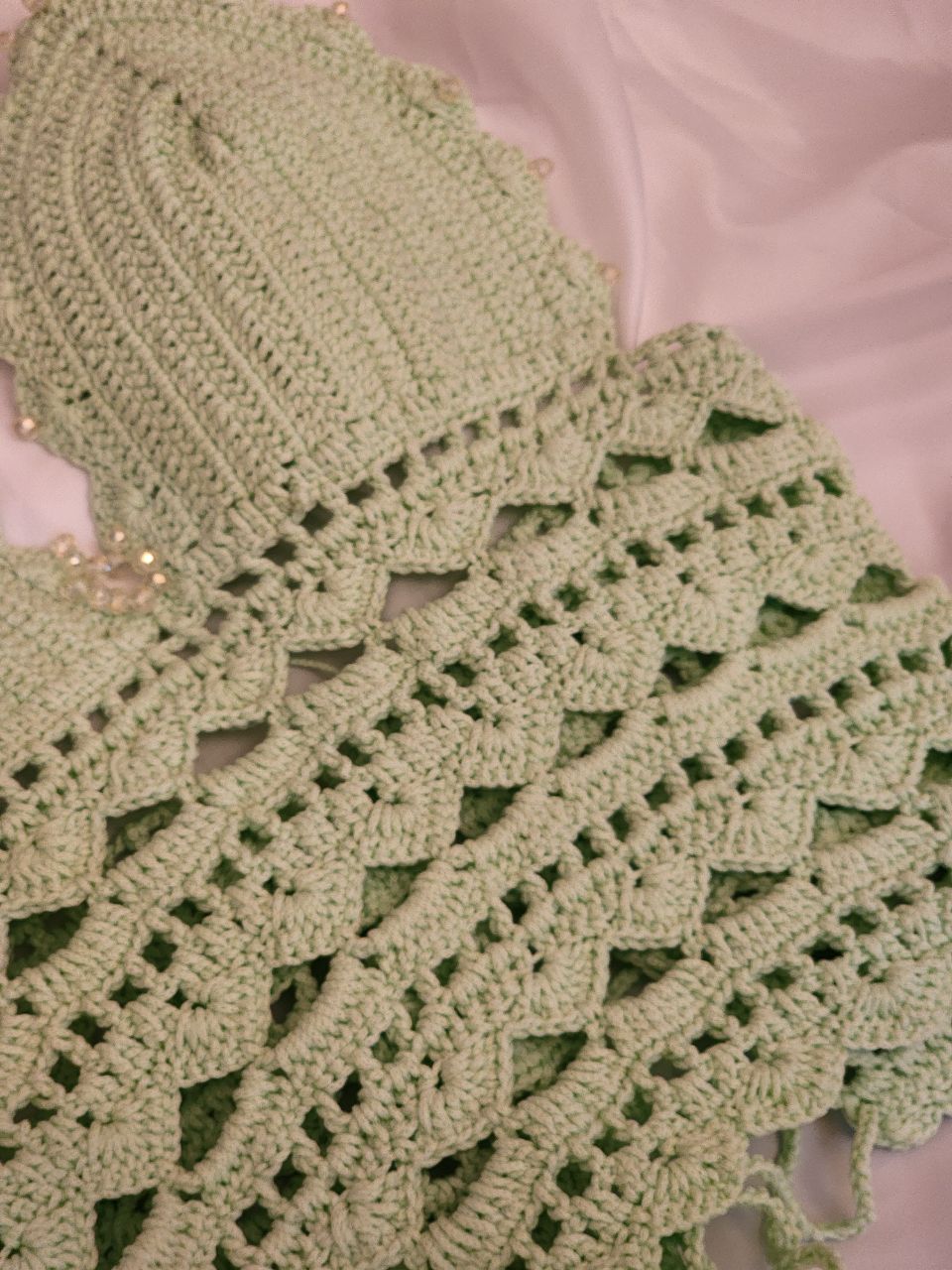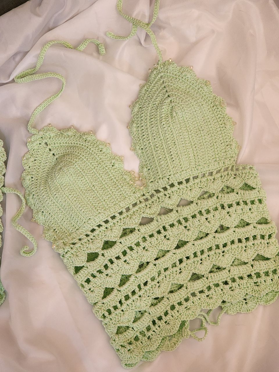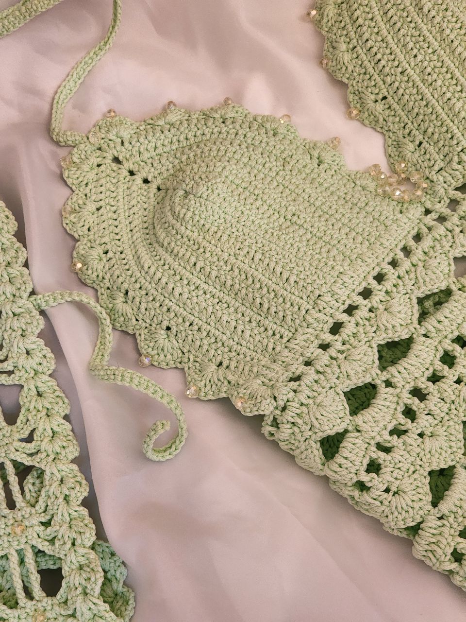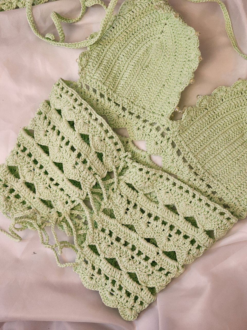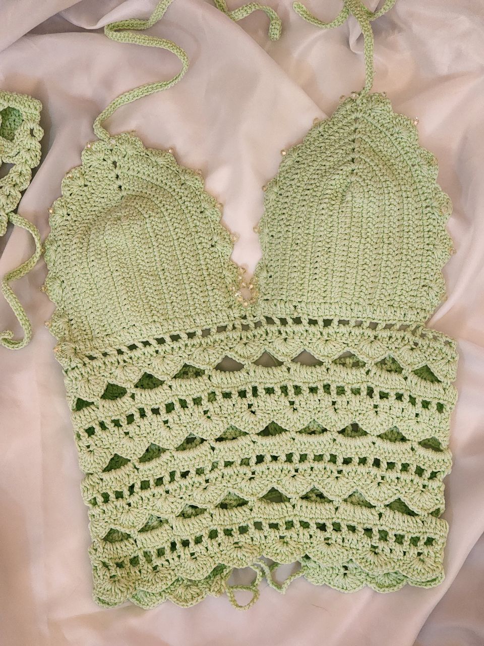 ست نیم تنه کراپ و هد سربند مکرومه سبز پاستیلی