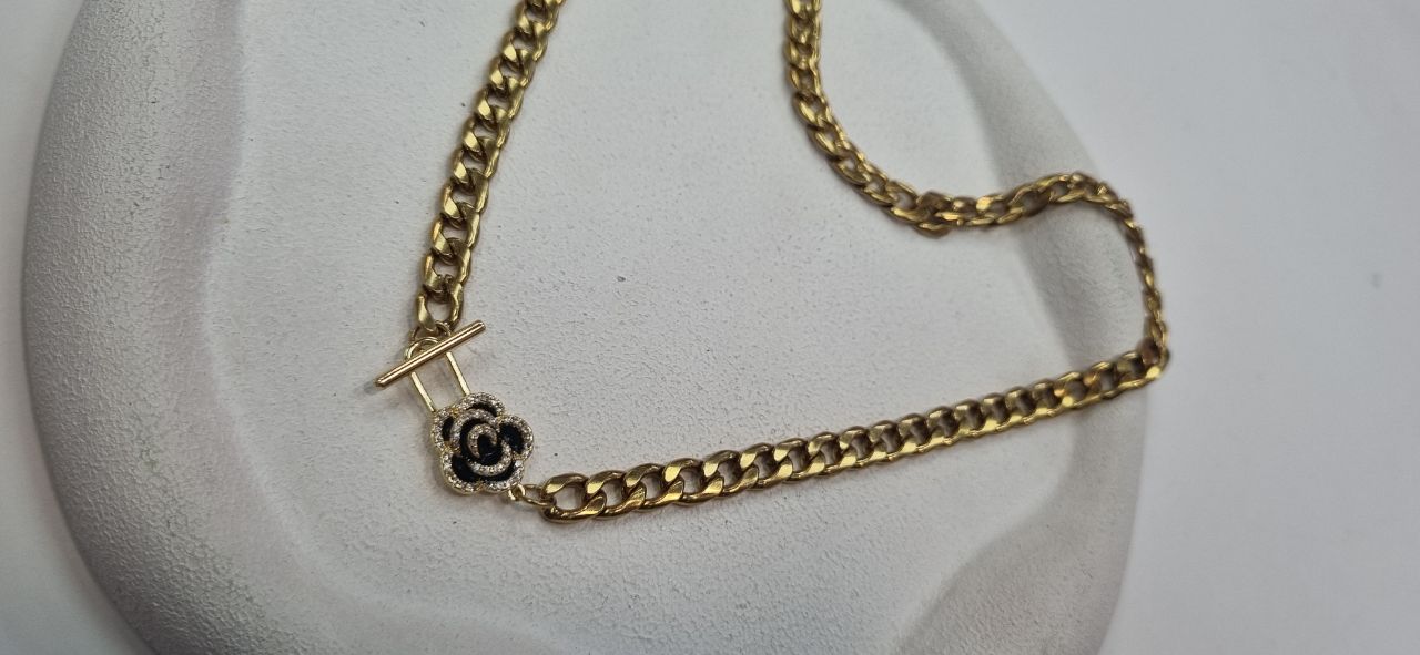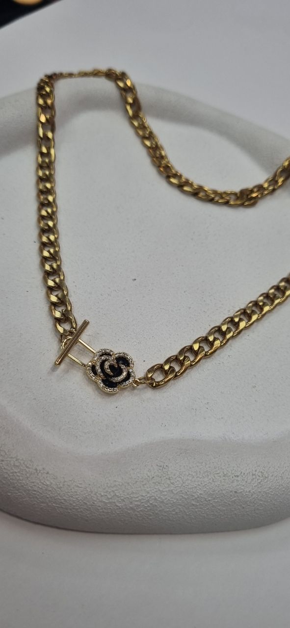 گردنبند استیل کارتیر و قفل تی گل رز نگین دار