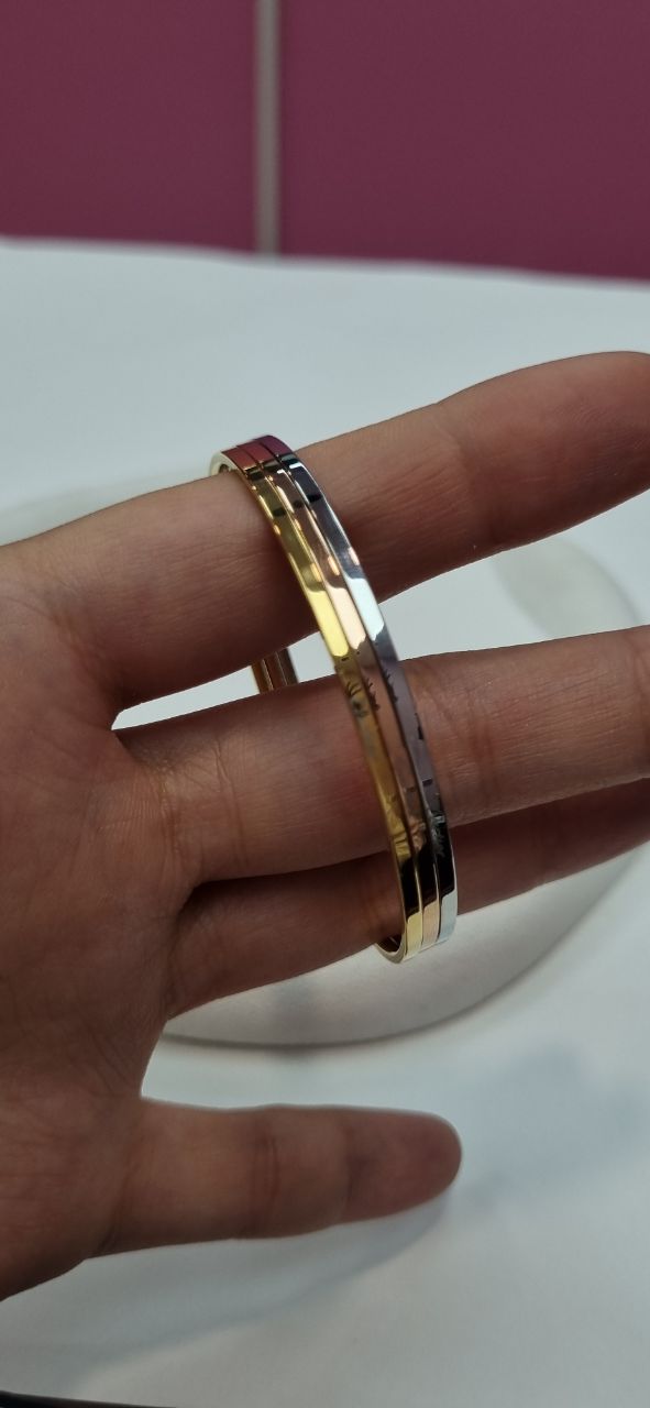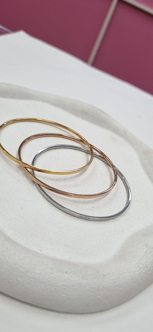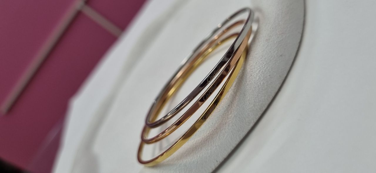 النگو ایینه سایز ۴ کارتیر سه رنگ رنگ ثابت برند کارتیر روی النگو حک شده دارای سه رنگ گلد رز گلد سیلور مناسب سایز ۴ متوسط استفاده مداوم مشابه طلا