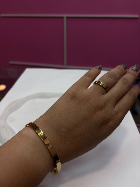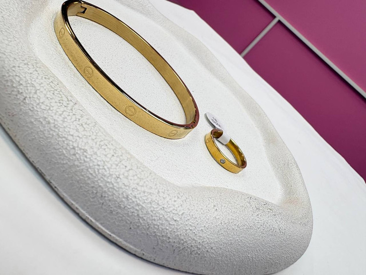 دستبند بنگل و انگشتر استیل وارداتی طلایی کارتیر