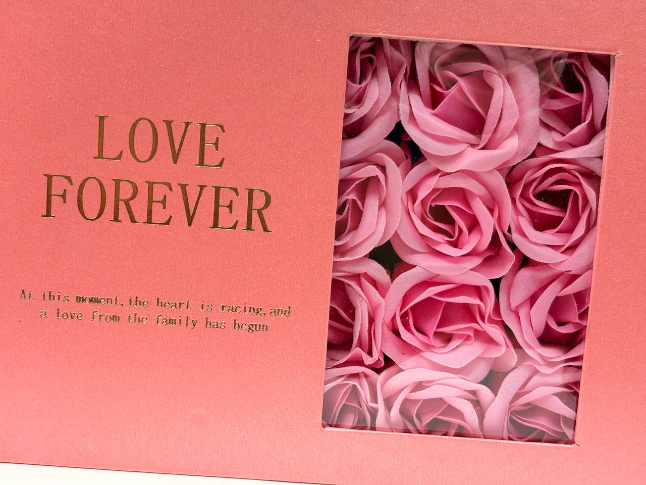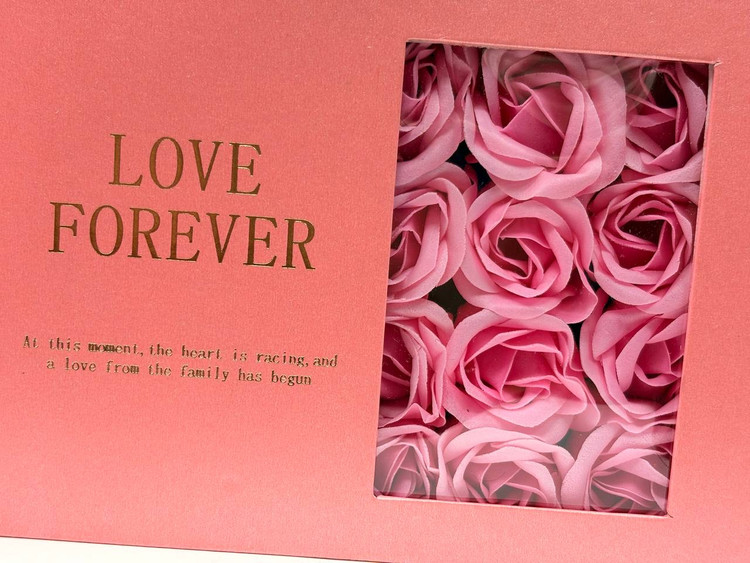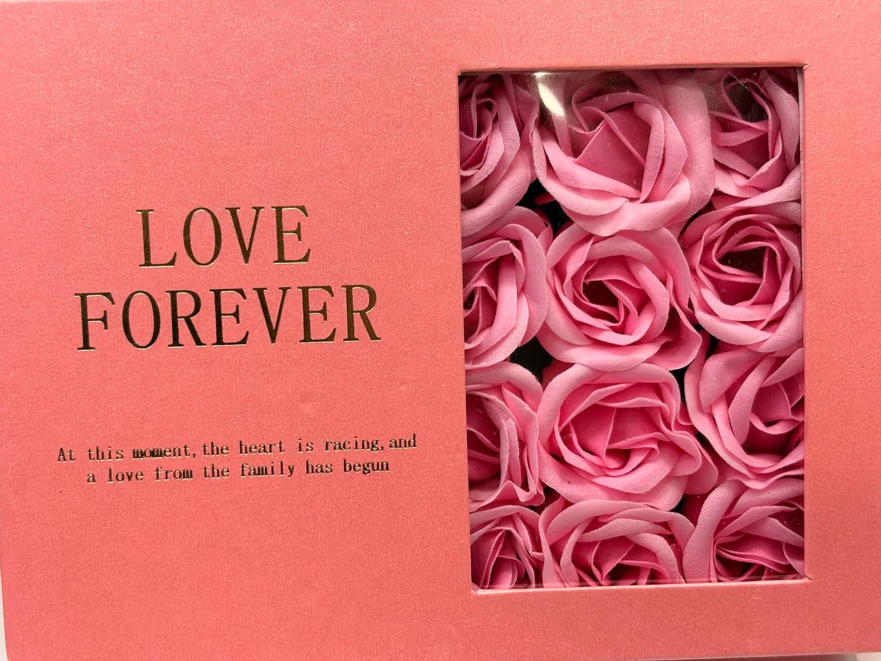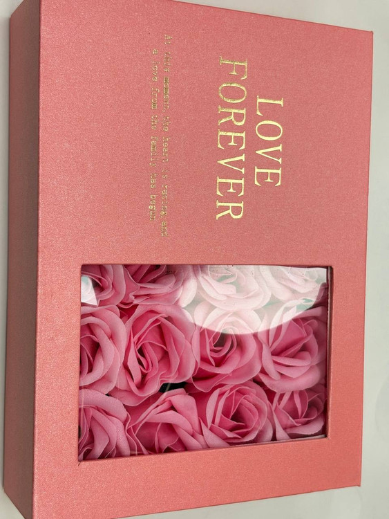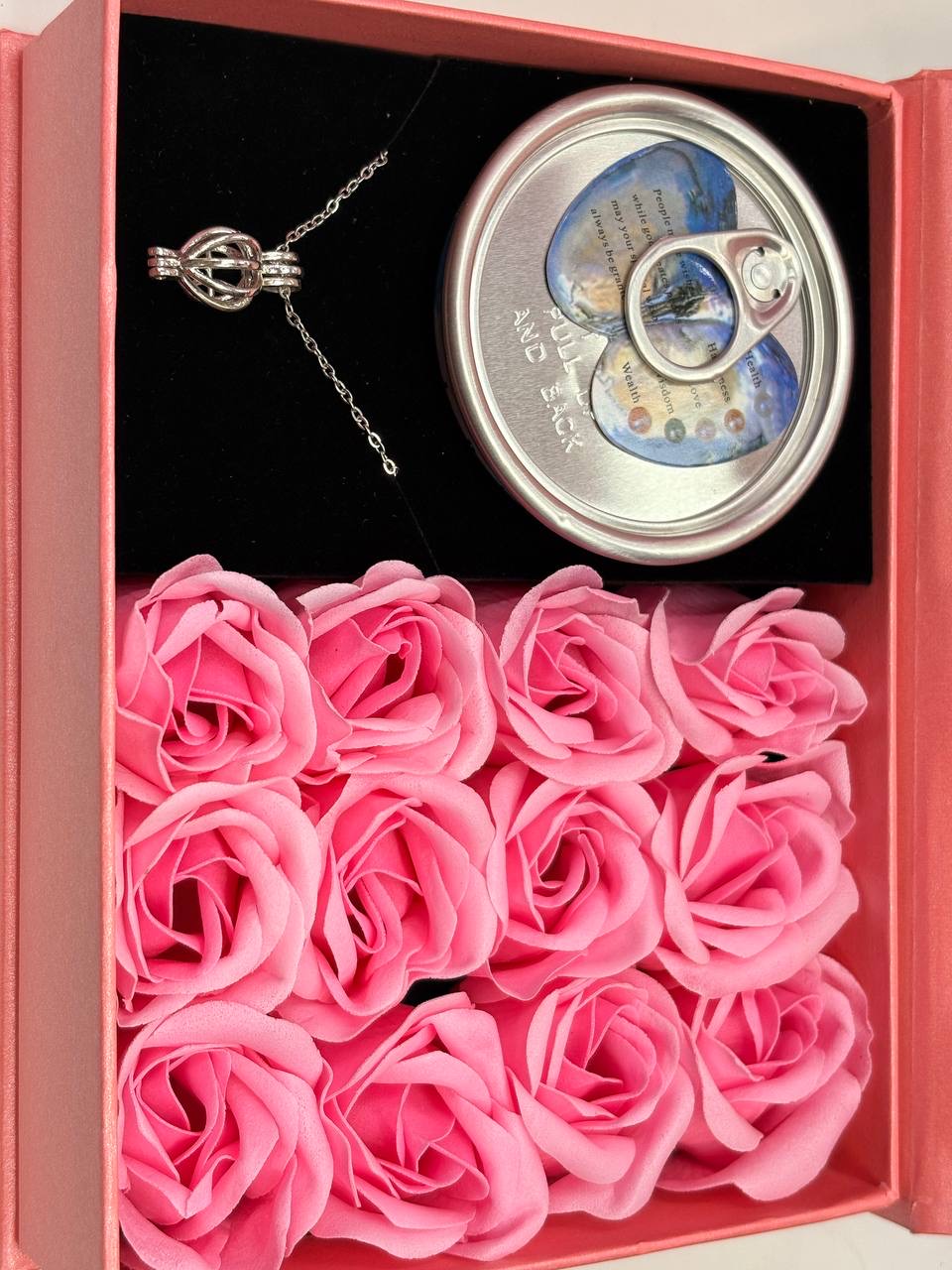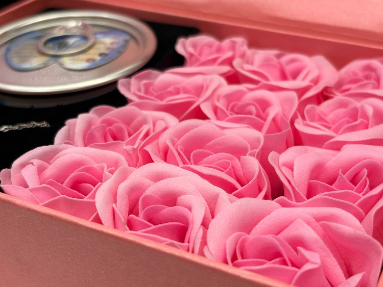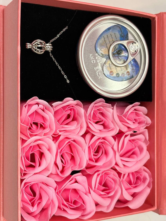 باکس کادویی گردنبند مروارید عشق بهمراه ۹ عدد گل رز فومی