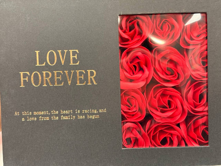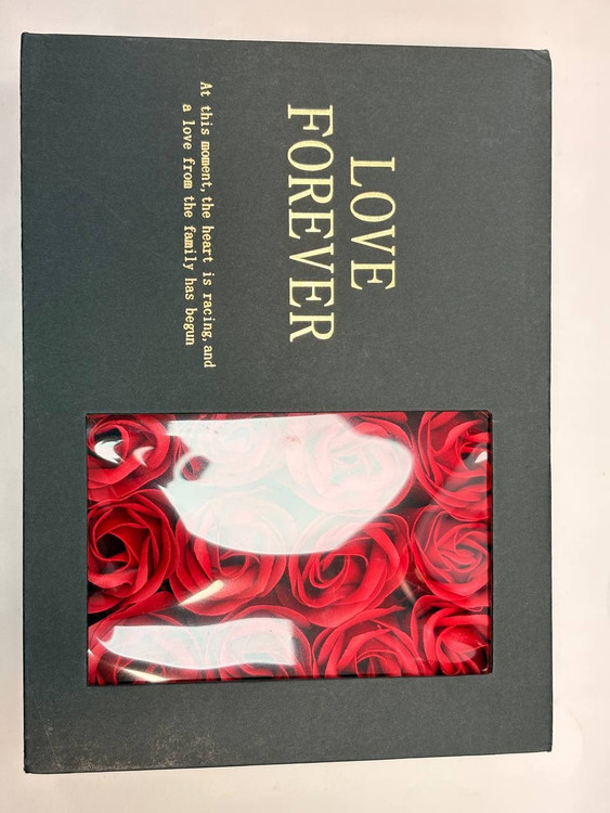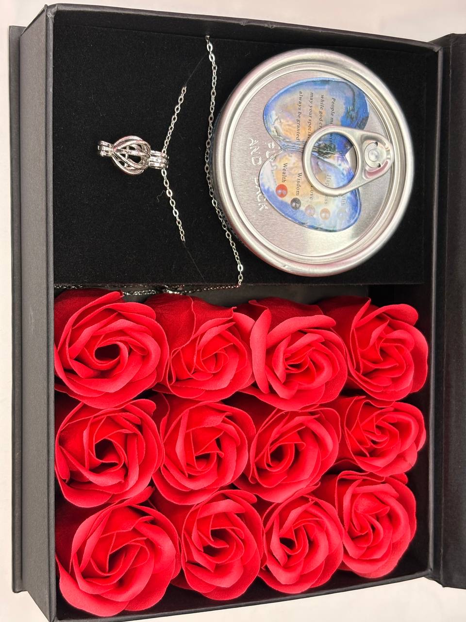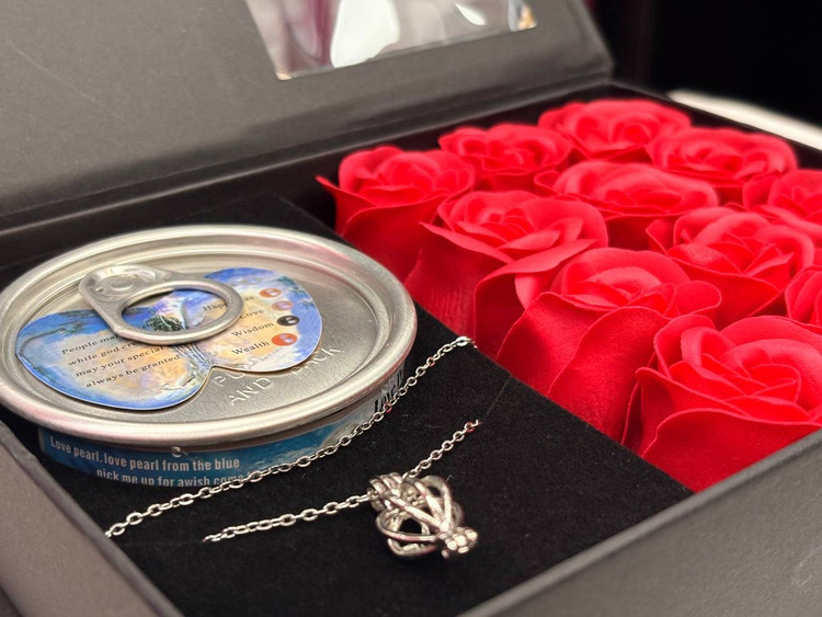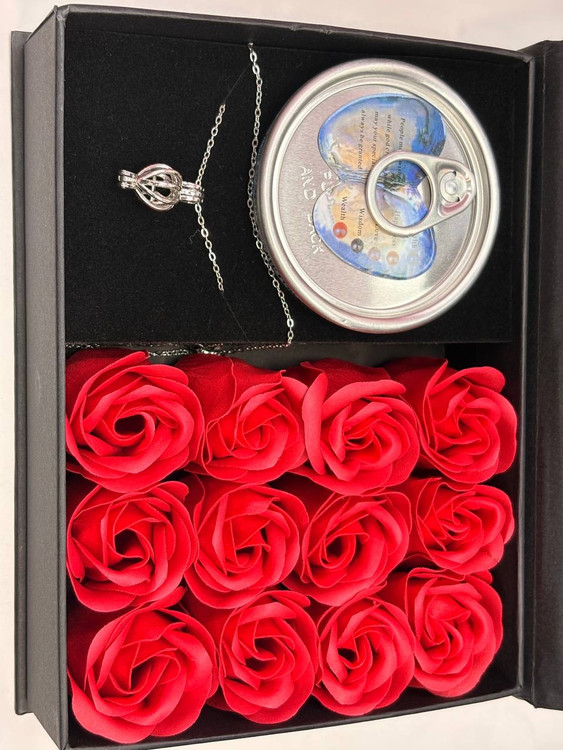 باکس کادویی گردنبند مروارید عشق بهمراه ۹ عدد گل رز فومی