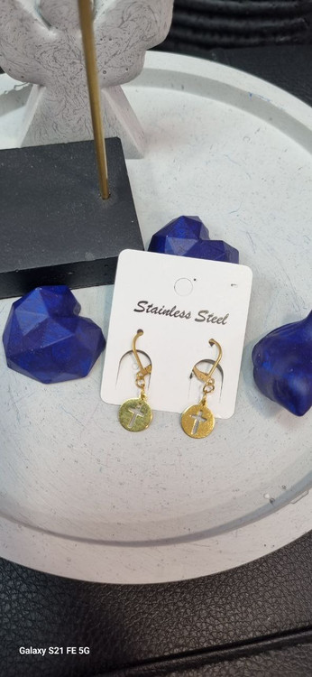 گوشواره استیل طلایی آویز صلیب طلایی