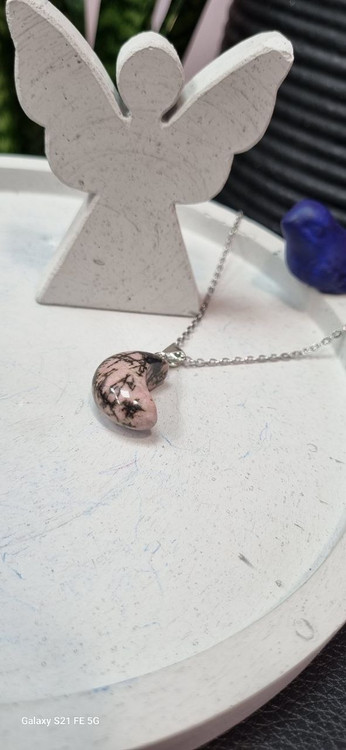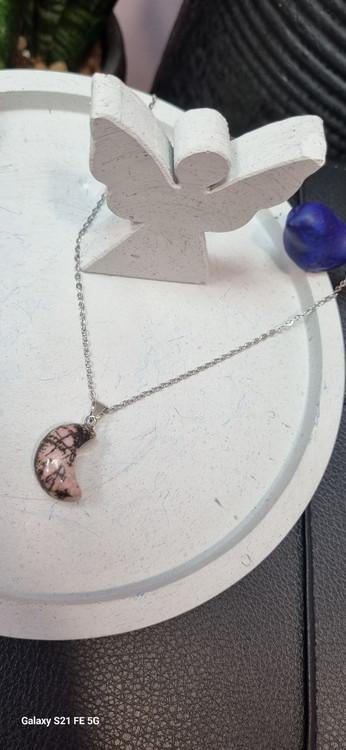 گردنبند استیل و اویز ماه سنگ رودونیت با زنجیر استیل نقره ای رنگ ثابت بدون ایجاد حساسیت و تغییر رنگ