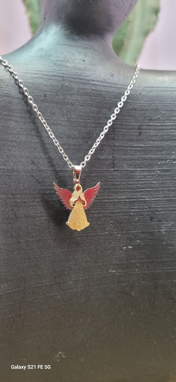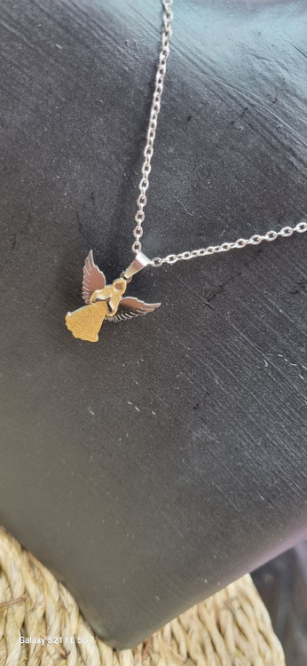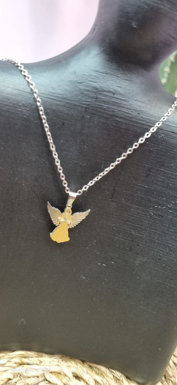 گردنبند استیل نقره ای با پلاک ۳ بعدی فرشته دورنگ رنگ ثابت بدون ایجاد حساسیت و تغییر رنگ