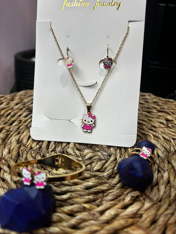 ست دخترانه گردنبند و گوشواره و بنگل و انگشتر استیل طلایی کیتی