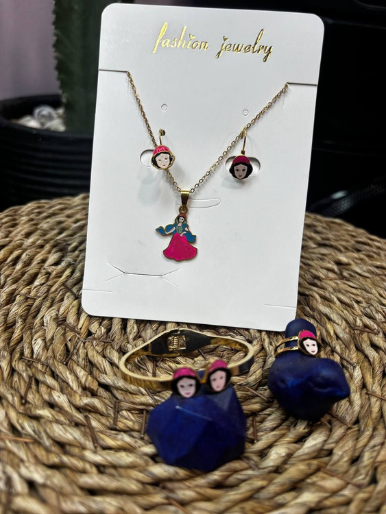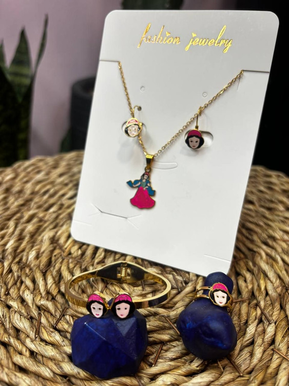ست دخترانه گردنبند و گوشواره و بنگل و انگشتر استیل طلایی سفید برفی